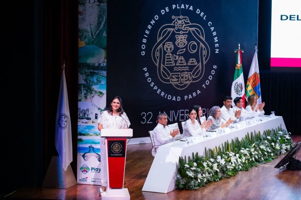 Acompañada por la gobernadora Mara Lezama, el magistrado presidente del TSJ Heyden Cebada, el diputado presidente de la Jugocopo Jorge Sanén y familias fundadoras, la alcaldesa recordó los orígenes del municipio, desde Xaman-Ha como puerto sagrado maya, hasta su consolidación como uno de los destinos turísticos más importantes de México.